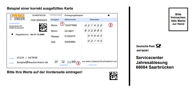 auch in diesem Jahr finden keine Vor-Ort-Ablesungen statt. Sie können Ihre Zählerstände bequem digital übermitteln: Ab 24.11.2025 versenden wir E-Mails mit einem Link zur Online-Erfassung. Unabhängig davon steht Ihnen unser Kundenportal jederzeit zur Verfügung (Link siehe Website). Ab 08.12.2025 erhalten Sie eine Ablesekarte unseres externen Dienstleisters. Bitte senden Sie diese ausgefüllt bis spätestens 09.01.2026 direkt an den Dienstleister zurück (nicht an die Stadtwerke Engen). Später eingehende Meldungen können leider nicht berücksichtigt werden.